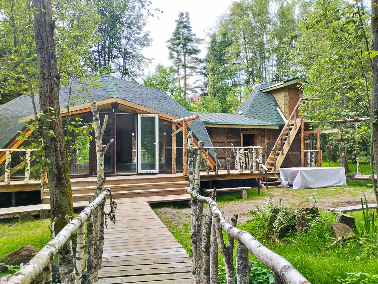 Площадь просторного зала с купольным покрытием- 64кв м. Зона кухни, раздевалки и душа- 30кв м. Предбанник, баня, стены которой изготовлены из натуральной конопли, просторная парная , травница-сеновал над парной с душистыми травами - 44кв м.